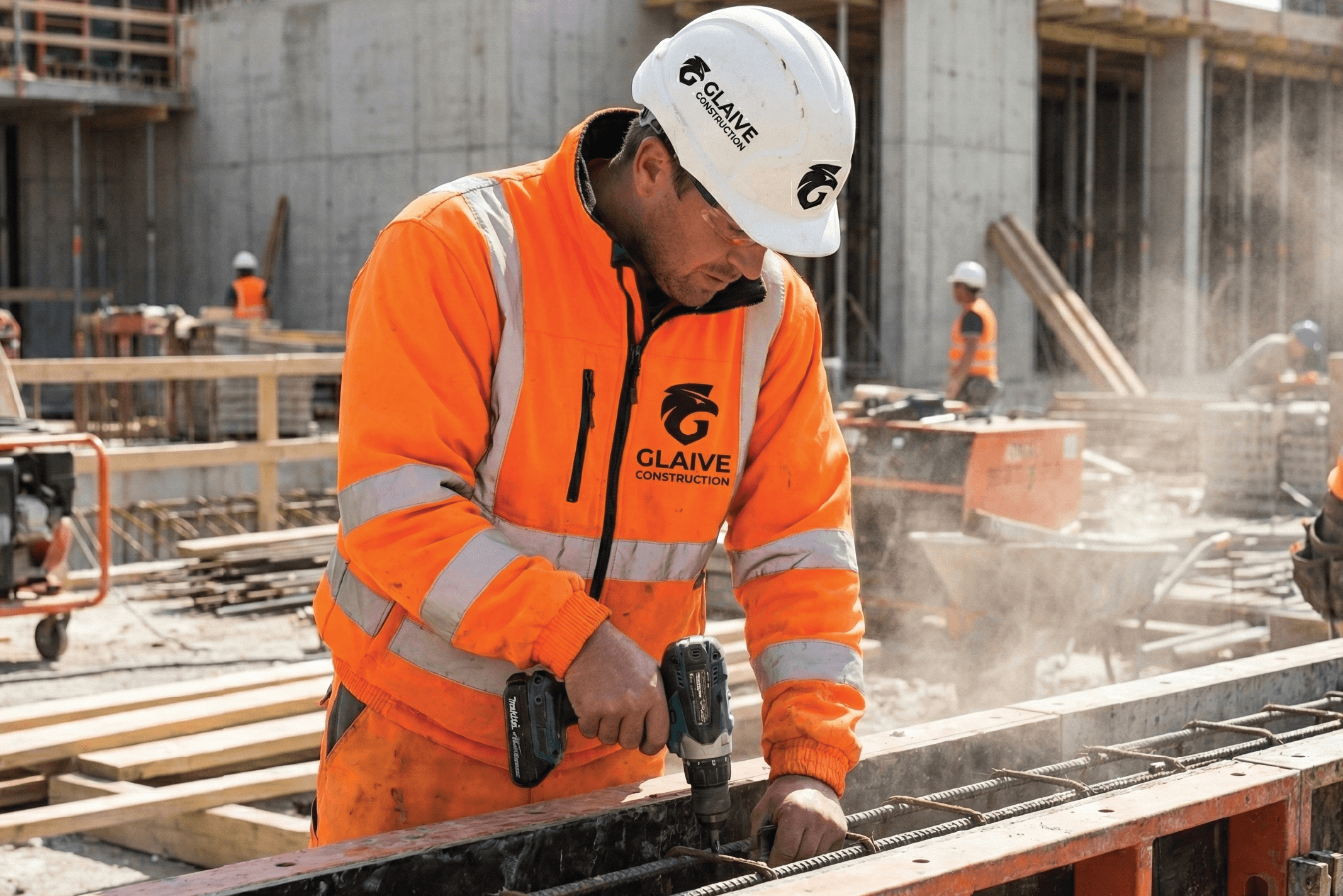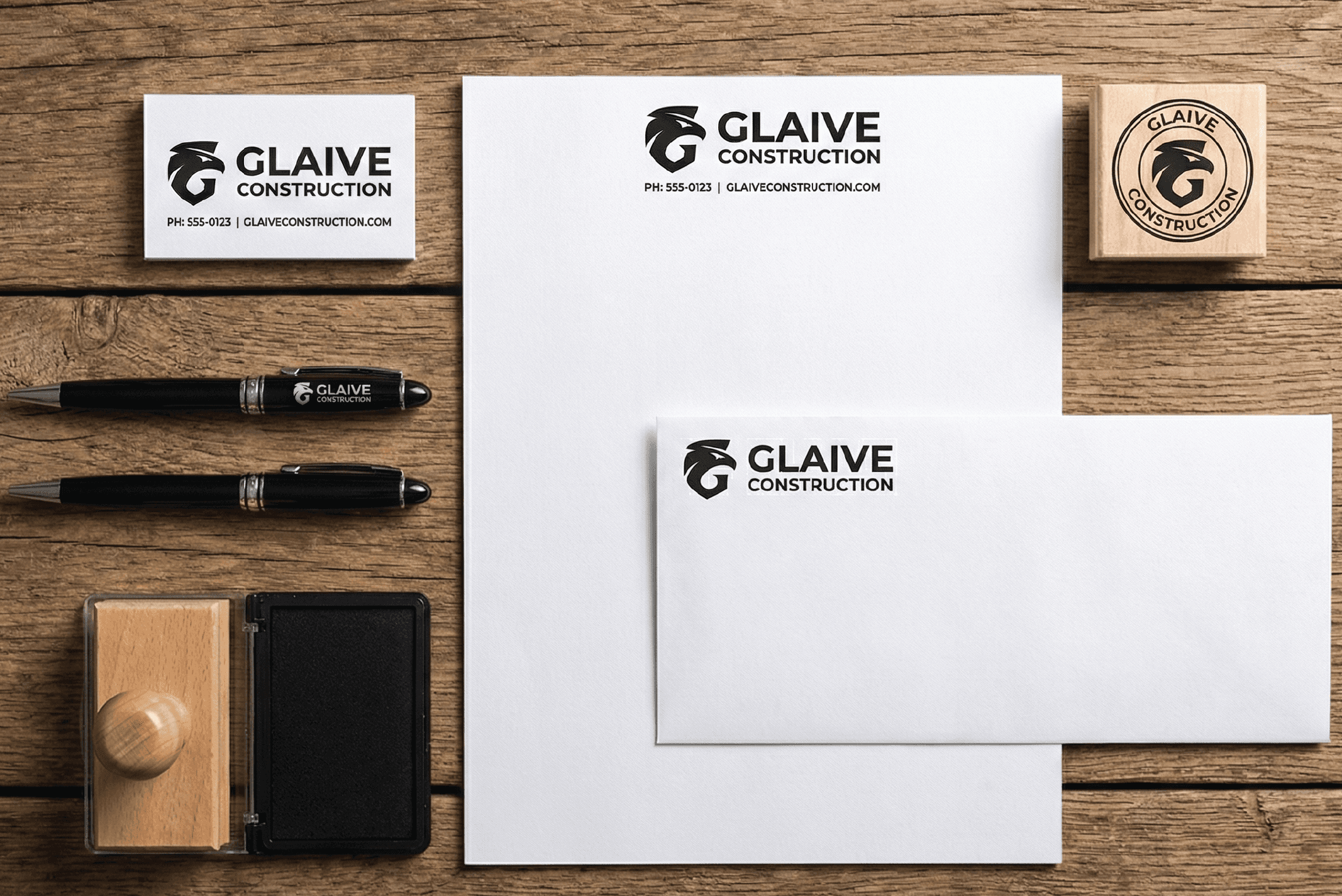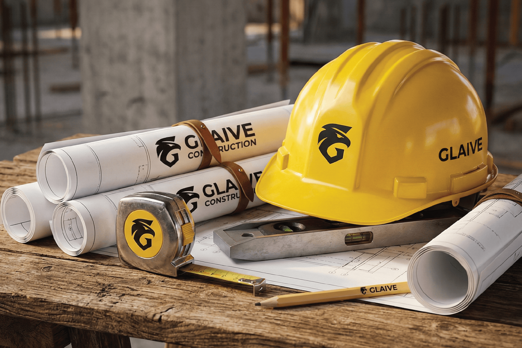 The final branding extended across a wide range of mockups — from corporate stationery to office signage, construction site banners, and digital interfaces — all designed to present GLAIVE as a modern, refined, and high-value construction firm.